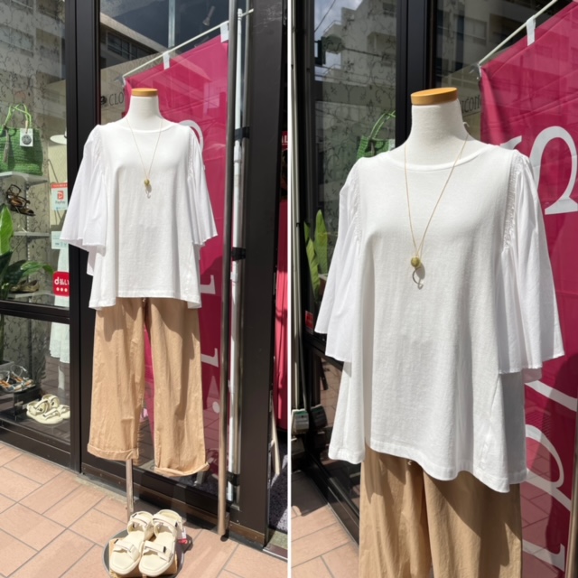袖フレアコットントップス💕SALE💕 コットン素材のカットソー✖️コットンのフレア袖のデザイントップス💕 お袖は肘くらいまで来るので、日焼け避け、冷房対策としても万能なアイテムです まだまだ続く猛暑に、トップスはお得にゲットしておくと良いですよぉ〜 トップス ¥9800+tax 30%オフ ¥6860+tax💕💕💕 2023年7月22日