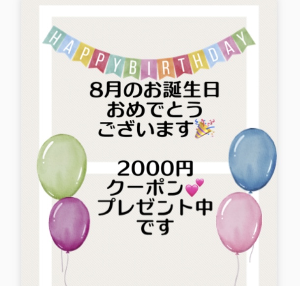 8月バースデーのお客様💕 いよいよ8月ですね😃 お誕生日おめでとうございます 今月中のご来店で、¥2000の割引をお使いいただけます。 ぜひお店に見にいらして下さいね。 遠方の方はご配送も承りますので、お気軽にご連絡下さい。 お買い上げ ¥5500以上にお使いいただけます💕 2023年8月1日