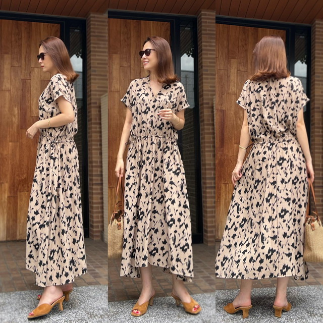ワンピース¥18,480 ベージュにブラックの模様のロングワンピース。 サイドは長く、ドラスト出来るデザインになっております。 動きがあって素敵ですよ✨ ポリエステル100% ワンピース¥18,480 2023年8月2日