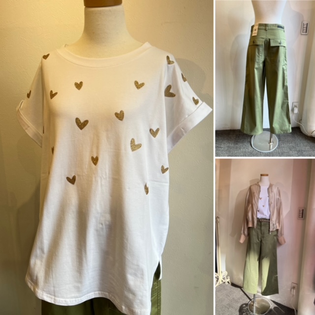 ハートTシャツ✖️カーゴパンツ💕 キラキラのゴールドハートが可愛いTシャツはイタリア🇮🇹インポート💕 カーキ色が素敵なカーゴパンツと合わせて、こなれ感のあるコーデに。 Tシャツ ¥6900+tax 30%オフ ¥4830+tax💕 カーゴパンツ ¥14800+tax 23インチ〜28インチで展開しております。 ただ今 24は完売しております 2023年8月7日
