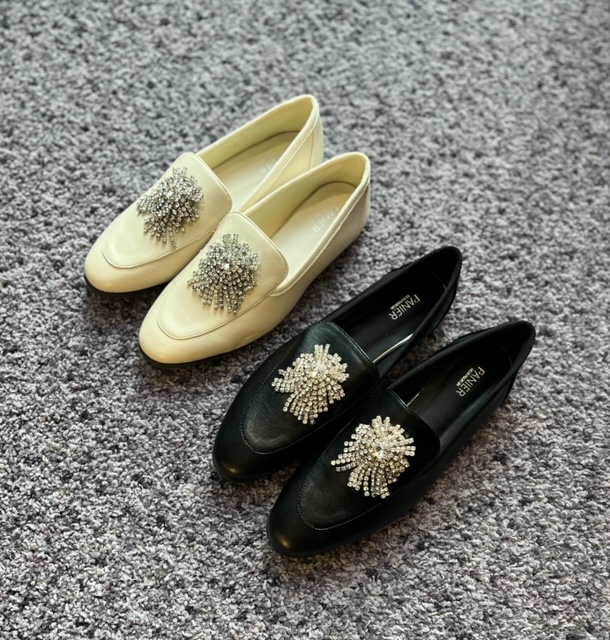 ビジューローファー💕 柔らかい合成皮革を使用したフラットローファーにトレンドのビジューを付けた1足✨メンズライクなパンツ合わせはもちろんワンピースやフレアースカート合わせもおすすめです✨深めのノーズで歩きやすいのもポイントです✨ ローファー ¥11,000+tax コメントは受け付けていません。