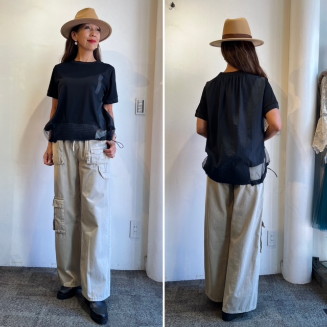 異素材切り替えトップス💕¥12000+tax 秋立ち上がりのコーデを後押ししてくれる、異素材切り替えのデザイントップス💕 上質な素材感で大人の余裕を感じさせてくれる⭐️⭐️⭐️高見えアイテム。 シワになりにくいポリエステル素材で、猛暑の中でも驚きの涼しさを体感できます。 メーカー完売のラスト一枚をお見逃し無く💕😃 カーゴパンツ ¥15000+tax サイズ フリー コメントは受け付けていません。