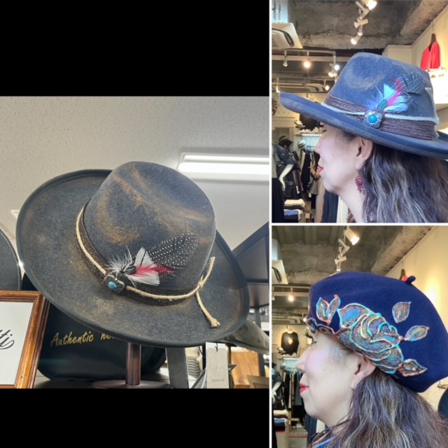 イタリア🇮🇹インポートの帽子 イタリアから素敵なハットとベレー帽が入荷しました。 他ではなかなか見ない、かなり凝ったデザインです。 帽子好きな貴女にお薦めです。 どちらも一点もので、追加が出来ないのでお早めにチェック下さいねーー フェザー付きテンガロンハット ¥19000+tax カラー チャコールグレーにプリント💕 フラワーデザインベレー帽 ¥17000+tax カラー ネイビー コメントは受け付けていません。