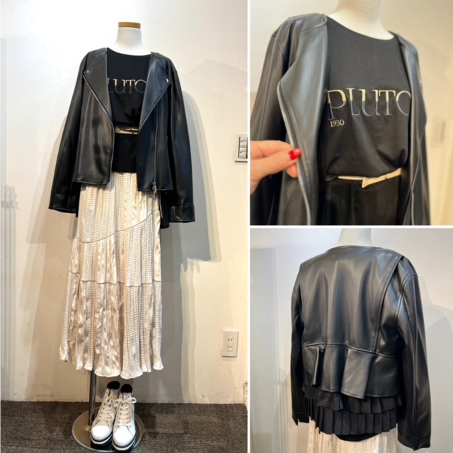 バイカラーの刺繍ロゴのロンTと、バックフリルがアクセントのエコレザーライダースJKで大人フェミニンコーデに仕上げました。 しなやかなロンTは、白、レモンイエロー、ラベンダー、ブラックの4カラーとなっております。