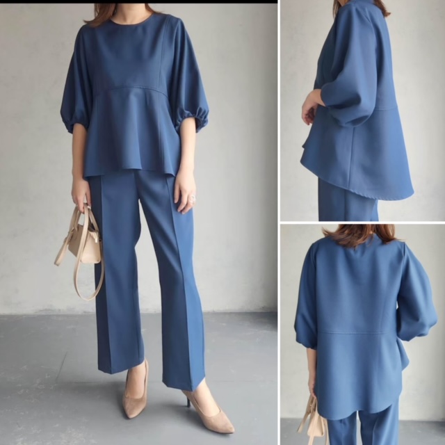 バルーンAラインブラウス ¥11000+tax💕 上質なポリエステル素材のしなやかなトップス💕 適度なバルーン袖でキチンと感もありオフィスにも使える一着💕 ウォッシャブルでシワ無しの素材感が忙しい貴女にお薦めの一着。 ファーベストのインナーとしても最適な一着です😍 アイボリー ブラックはもちろん、目を引くスモーキーブルーもお薦めカラーです 小柄さんにもお薦めです💕 カラー ブルー、アイボリー 、ブラックの3カラー サイズ 身幅52 着丈62/71 素材ポリエステル100 手洗い可 セットアップのパンツはブラックがございます コメントは受け付けていません。