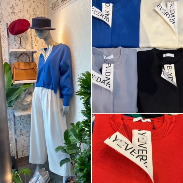 ロゴニットカーディガン ✖️ワイドパンツ オリジナルのロゴニットテープがアクセントになる、綺麗色のカーディガン💕 シンプルだけど、キラッとお洒落さが光るアイテム💕 ポリエステル素材でとっても軽量で軽い着心地。 カーディガン ¥9800+tax アイボリー、グレーブラック、ブルー、レッド パンツ ¥13800+tax アイボリー、グレー、ブラック サイズ38 2023年9月9日