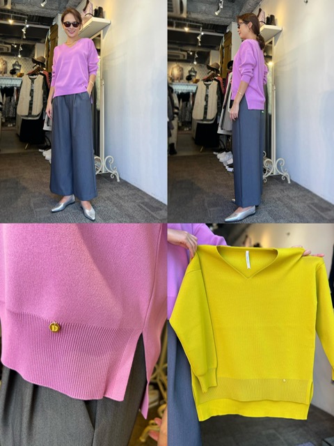 ニット¥14,300 パンツ¥15,180✨ パープル×グレーコーデ💜🩶 程よいVネックに、前後差のある丈感、ゴールドのワンポイントなど、シンプルな中にもデザイン性のあるニットです✨お色違いはイエローもございます🫧 ニット¥14,300 パンツ¥15,180 コメントは受け付けていません。