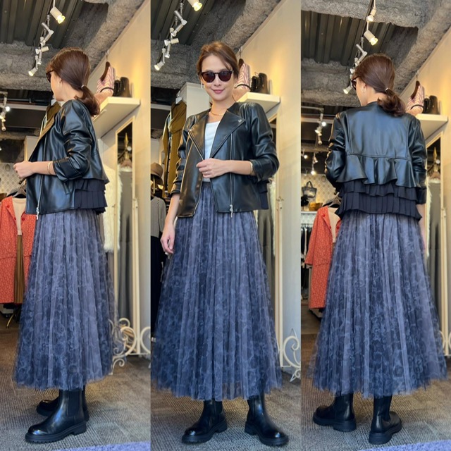 フリルライダースジャケット¥18,480✨ 定番のライダースは間着としても大変便利なアイテム✨ フーディーを中に着たり、肩がけしても素敵です✨ 甘めのチュールスカートにも、パンツにももちろん合わせていただけます❣️ バックのフリルが他にはないデザインです💕💕 フリルライダースジャケット¥18,480 スカート¥14,300 コメントは受け付けていません。