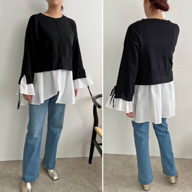 今すぐから春まで着られる軽いニットとシワになりにくい布帛をドッキングして、シルエットスッキリ⭐️⭐️⭐️