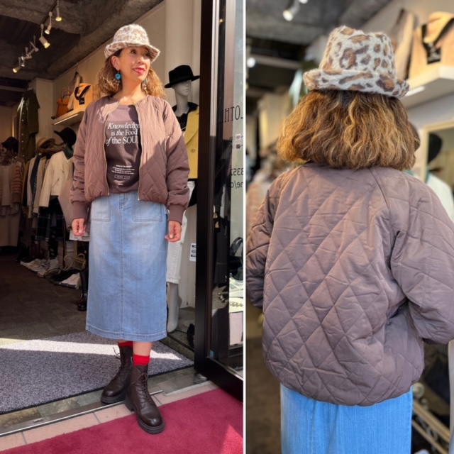 リバーシブルキルティングJK💕¥6900+tax スポーティーなデザインが素敵なキルティングのリバーシブルジャケットが到着しました。 無重力の軽さで、めちゃ暖かい⭐️⭐️⭐️ 秋から春まで大活躍するジャケットです。 お写真はブラウンです。 他に、グレージュ、ブラックがございます。 レオパード中折れ帽子 ¥6900+tax デニムスカート ¥12800+tax サイズ 38 本革ブーツ ¥14800+tax サイズ 22.5〜25.0 ソックス ¥600+tax モデル身長168cm コメントは受け付けていません。