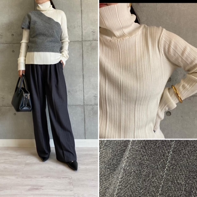 ストライプワイドパンツ ¥16000+tax 起毛素材の暖かいワイドパンツ💕 グレーにアイボリーのストライプがマニッシュな一本💕 ウェストゴム仕様でめちゃ楽ちん。 オンにもオフにも大活躍のパンツです💕💕💕 サイズ フリー ハンドウォッシャブル リブタートル ¥11000+tax シルク、テンセル混紡の上質な肌触り。 オフ白、ボーダー、ブラック コメントは受け付けていません。