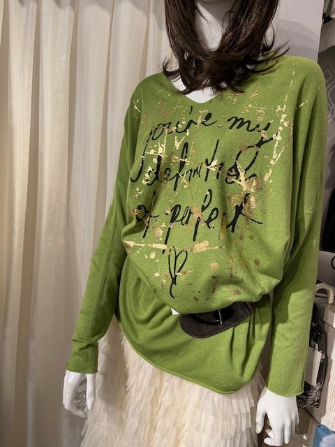 インポートニットトップス💕¥9800+tax スッキリしたVネックのニットソーに英字とペンキ風の箔プリントが素敵なチュニックプルオーバーが🇮🇹イタリアから再入荷しました💕 スキニーパンツや、スカートなどと合わせてインポートのクールな着こなしを楽しめる1着😍 非ウール素材なので、肌触りもGOOD💕 こちらのグリーンの他に、ライトベージュもございます。 ハンドウォッシャブル😃春先4月までは大活躍してくれそう💕 コーデはベルトでブラウジングしております。 コメントは受け付けていません。