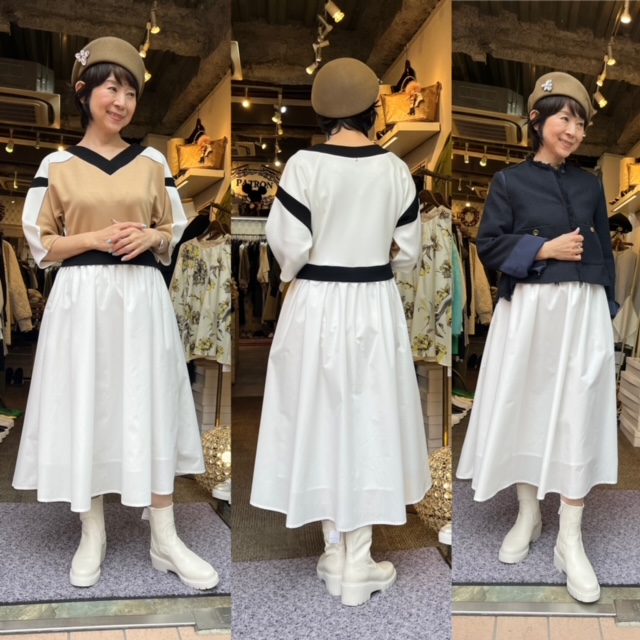 配色切り替えワンピース✖️ジャケット ベージュ✖️ネイビー✖️ホワイトの配色が素敵なワンピース が入荷しました。 白スカートには透け防止の裏地が貼ってあるので一枚でも安心💕 上半身は薄手のポンチ素材で伸縮します。 一枚でスタイリングが決まるのはもちろん、ジャケットを合わせるときちんと感もあり⭐️⭐️⭐️ 限定2着のみ。 ワンピース Mサイズ ¥19000+tax 上半身 ポリエステル80コットン20 スカート レーヨン55テンセル40ポリウレタン5 ジャケット ¥17800+tax ブーツ 牛革スペイン🇪🇸インポート ¥32000+tax コメントは受け付けていません。