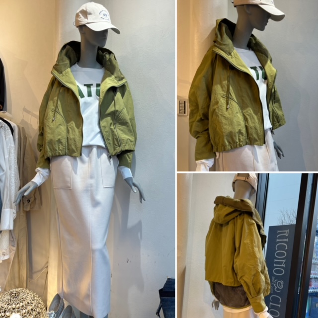 春のブルゾングリーン ハリのあるシャカシャカ生地のポリエステルブルゾンは、お洒落なモスグリーンをセレクト。 ボトムスに白、黒、ベージュなどを選んで、コントラストを楽しむもよし。 写真写りも良い、カラージャケットです。 驚きの超軽量にもびっくりしますよぉ〜 ブルゾン ¥29700 スカート ¥10010 キャップ ¥2700 カットソー ¥7590 すべて税込み コメントは受け付けていません。