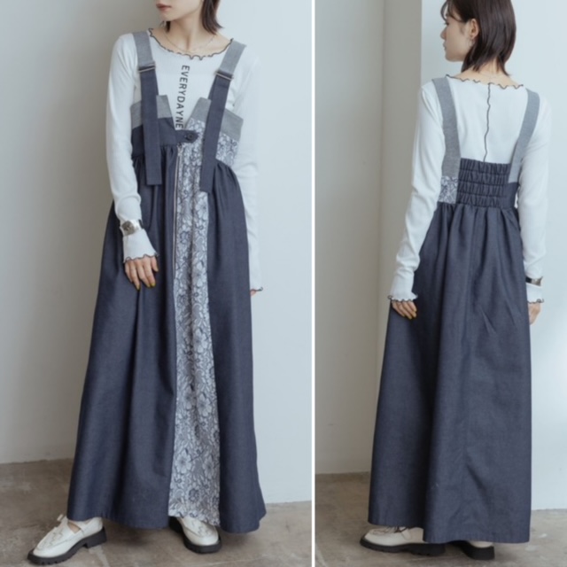 パネル切替デニムジャンスカ ¥20,350(税込) <<レース×デニム×ツイードの甘辛ミックスジャンスカ>> レース、デニム、スラブツイードの三素材を大胆に切り替えたジャンバースカート。 ウエストの切り替え位置を高めに設定してるので脚長に見え、スタイルアップして見える頼れる一枚です。 紐の長さを変えてお好みの位置で着用いただけます。 一枚で様になるワンピースはブラウスやTシャツなど、インナーを変えてもスタイリングを楽しんでいただけます。 ポケット付きなのも嬉しいポイント。 カットソー ¥9790 税込 白、黒の2カラー サイズ 総丈 身幅 38 131 40 コメントは受け付けていません。