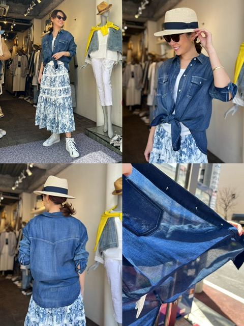 シャツ¥17,600 スカート¥17,930✨ 透け感のあるシアーな素材のデニム風シャツ✨ 薄手で柔らかい肌触りなので、カジュアルな印象のデニムシャツに大人っぽさをプラスしてくれるアイテムです💕 スカートは大人気のボタニカルプリントスカート🌸 シャツ¥17,600 スカート¥17,930 コメントは受け付けていません。