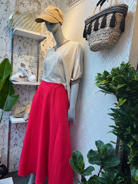 レッド✖️ベージュ💕 華やかな赤の🟥フレアスカートが到着しました。 今回はayaneの新作デザイントップス✖️キャップでカジュアルコーデにアレンジ。 肘まである着丈のトップスは大人女子に人気です。ベージュ、ブラック、ライトカーキの3カラー トップス ¥15180 スカート ¥14300 サイズ38 バックゴム仕様。 素材 麻、レーヨン コメントは受け付けていません。