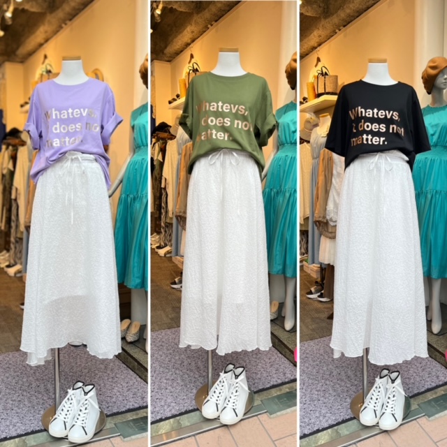 デザインT✖️シアースカート💕 今季人気のシアー素材のフレアスカートに、スポーティーテイストのデザインTを合わせたコーデ💕 ラベンダー✖️シルバー、カーキ✖️ブロンズ、ブラック✖️ブロンズの3カラー どれもかなりお洒落な色合いです。 着丈もしっかりあるので、お腹周りもサラッとカバー出来ますよん💕 Tシャツ ¥8690 コットン65%ポリエステル35% コメントは受け付けていません。