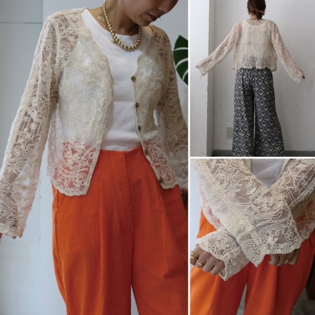 レースカーディガン ¥5500 税込 コンパクトなショート丈のレースカーディガンが再入荷しました。 サラッとした着心地で、冷房除けに大活躍してくれます。 お袖や裾のレース使いや、ウッドボタンになっており、そこもまた雰囲気がありおすすめのポイントです。 オールシーズン大活躍してくれそう。 破格のお値段なので、即売れアイテムとなっております。 お見逃しなく💕 カラー アイボリー サイズ詳細 身幅 84cm 袖丈 54cm 肩幅 39cm 着丈 47cm モデル身長 160cm 素材 ポリエステル100% コメントは受け付けていません。