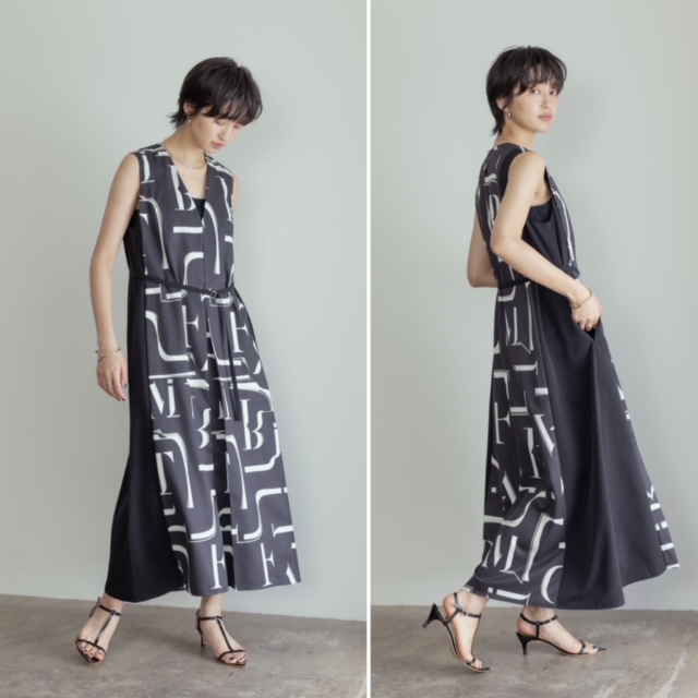 クラシカルで存在感のあるフォントプリントが目を引くノースリワンピース。