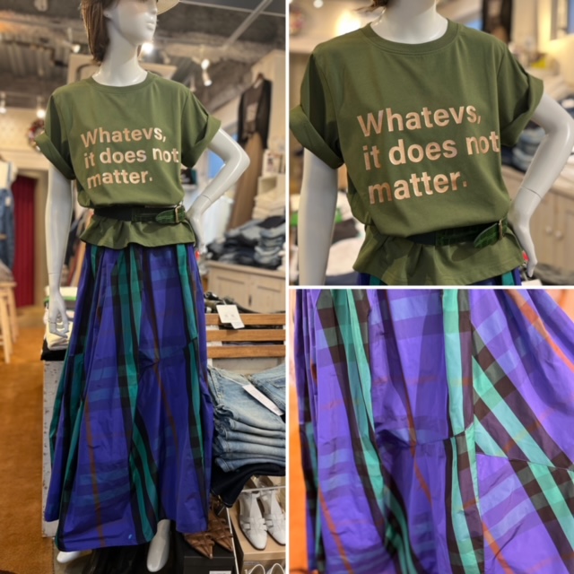 カーキ✖️パープルのコーデ🪻 秋新作のパープル系チェックのスカートには、抹茶みたいなカーキのトップスで合わせると、ブリティッシュ🇬🇧な雰囲気になってお洒落なのです。 テイシャツは上質なコットン素材で涼しく、型崩れ無し。 これから秋も万能にお使いいただけてーーー何と40%オフ🎉🎉🎉 他に、チャコールグレー、ブラックもございます。 トップス ¥9790 ➡️ ¥5874 スカート ¥16500 全て税込 コメントは受け付けていません。