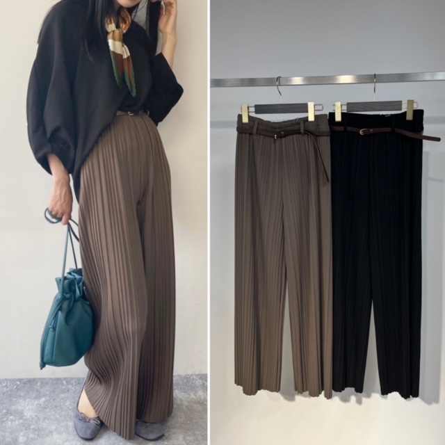 ショート丈のトップスと合わせてベルト見せさせると今風スタイルになる、ストレッチ素材のプリーツパンツ💕