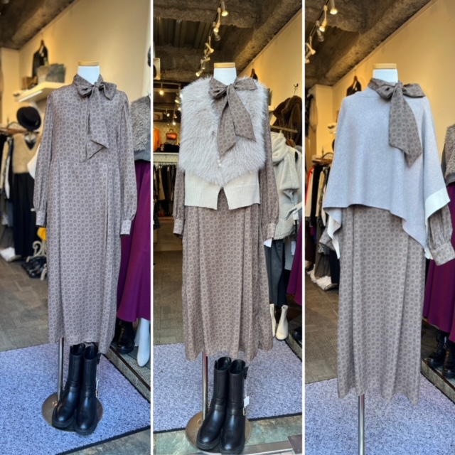 ボウタイワンピースの3コーデ💕 クラシックなデザインだけど、めちゃ軽くて着やすい楽ちんワンピースを、ファーベストやニットポンチョ でコーディネートしてみました💕 エコファーにパールがポイントのファーベストは、めちゃお得な¥12000+tax🎉🎉🎉 1番左のポンチョニットは、丸首の定番ニットとセットで驚きの¥5900+tax😆🎉 昨年もあっという間に完売のアイテムです。 ブラック、グリーン、イエロー、ベージュ配色の4カラーで展開しております ぜひお早めにチェックされて下さいねーー ワンピース ¥19900+tax コメントは受け付けていません。