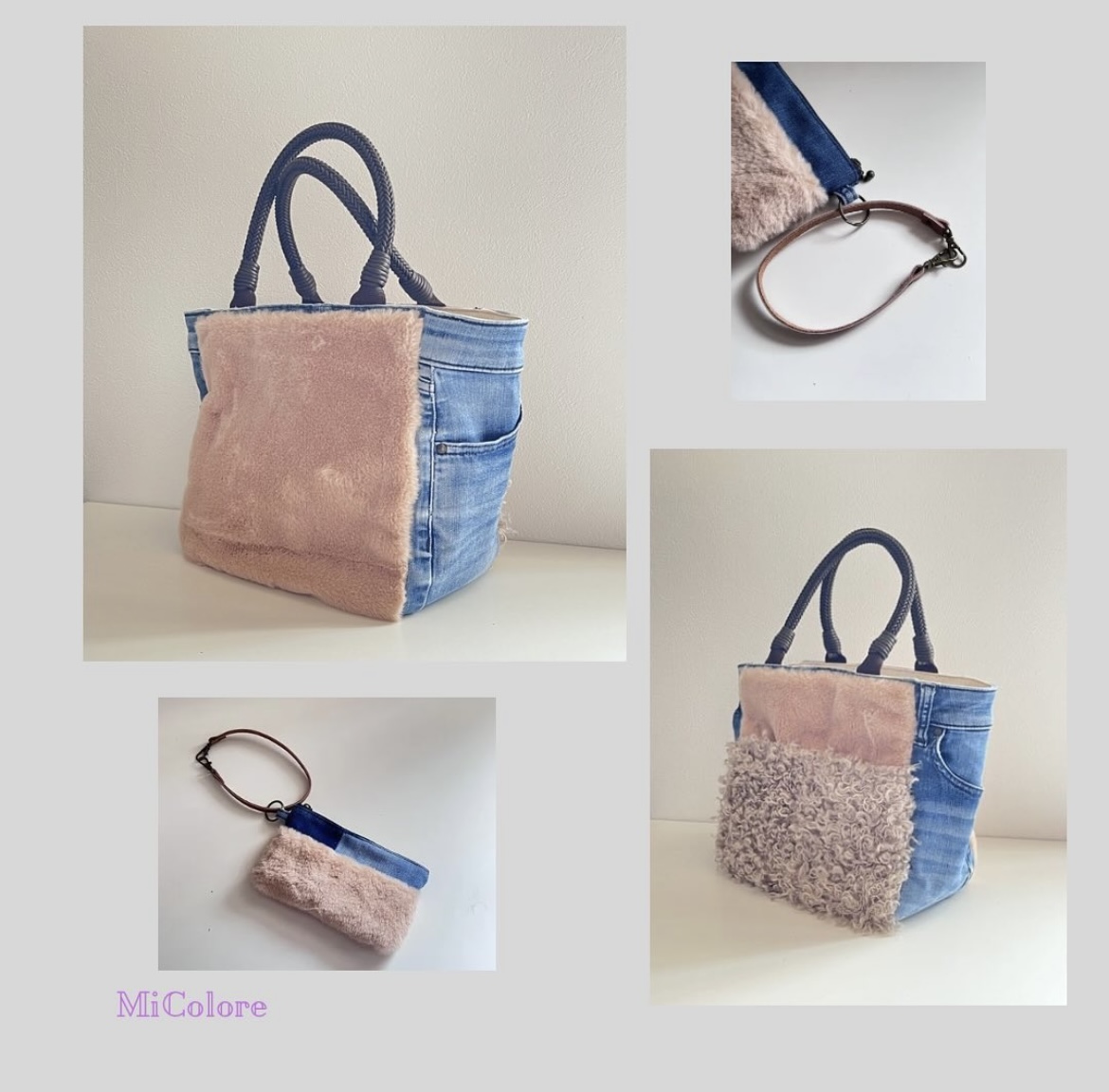 クルクルっとした羊さん風エコファーとラビット調エコファーにデニム素材を配色した、リコノクローシェとミコローレさんのコラボバックが出来上がりました💕