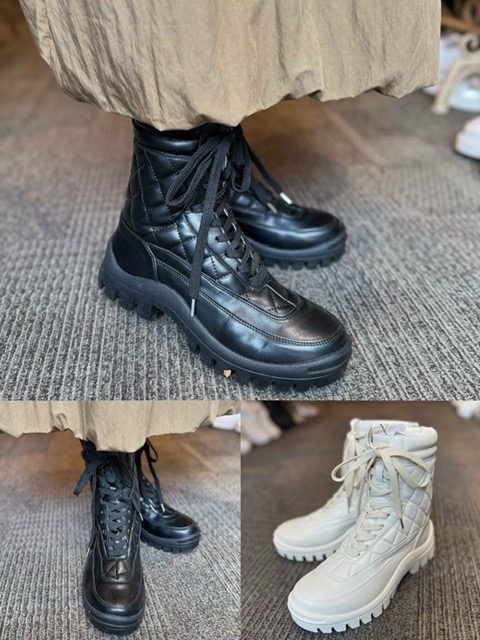 内側ファスナーで脱ぎ履きしやすく、履き心地も最高なブーツ💕 編み上げ&キルティングデザインがおしゃれです🫧✨