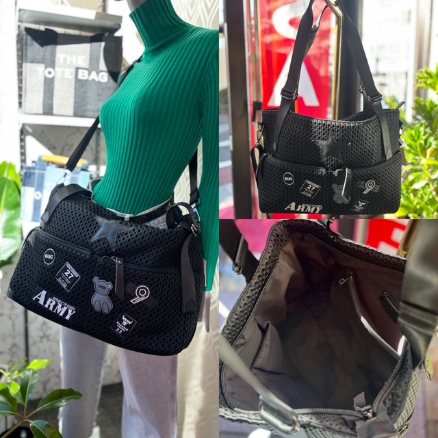 メッシュボストンバッグ💕 大容量なので、小旅行やスポーツにも最適✨ ワッペンが可愛くてオシャレ✨ ポケットもいっぱいあって便利です✨ 【素材】 ナイロン100% 別布 合成皮革(ポリウレタン) 裏地 ポリエステル100% バッグ ¥15,000+tax コメントは受け付けていません。