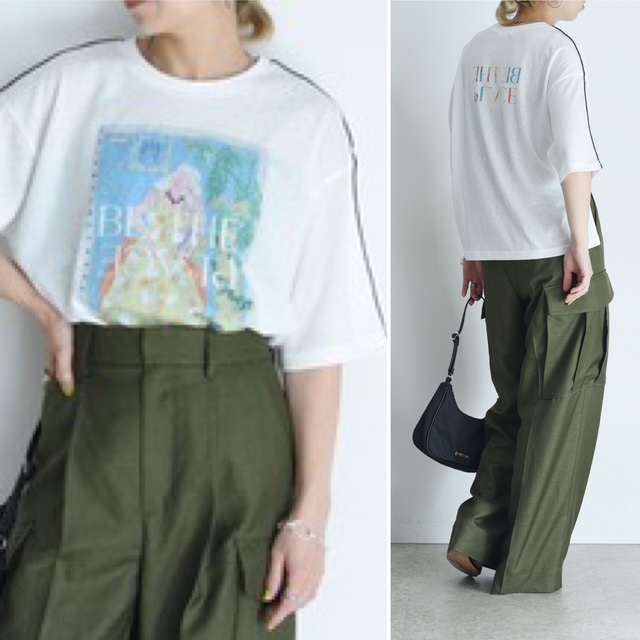Eimee Law アートプリント 配色メロウシアーTシャツ ¥7,590( 税込) 《アートで魅せるTシャツ》 ●展示会人気アイテム● フロントにあしらった印象的なアートプリントが視線を引きつけるデザインTシャツ。 バックにはフロントのアートを切り取ったロゴをプリントし、後ろ姿まで洗練された印象に。 やわらかく程よい透け感のあるテンセル混の天竺を使用し、肩から袖にかけてほどこされた配色メロウがさりげないアクセントになっています。 ゆったりとしたシルエットで体のラインを拾いにくく、さらっと1枚で着ても、レイヤードスタイルでも活躍するアイテムです。 素材ポリエステル36%綿32%再生繊維(セルロース)32% 2025年6月9日