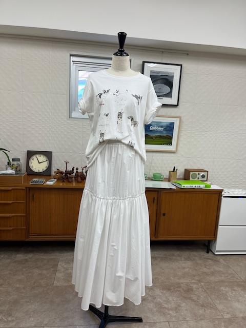 ワンちゃんアートのTシャツ💕¥4900+tax デザイナーの手書きのモチーフが可愛い、コットン素材のTシャツ💕 白スカートでフェミニンコーデにしてみました。 Tシャツ ¥4900 スカート ¥7900 総ゴムでフリーサイズ 裏地付き⭐️ 全て外税 2025年6月12日