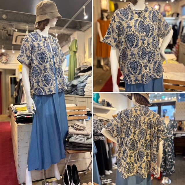 ダマスク柄BACKギャザーブラウス💕 薄手のコットン生地に、美しいダマスク柄をプリント。通気性に優れ、爽やかな風がすっと抜けるような清涼感のある素材です✨ 背面にほどこされた大胆な切り替えギャザーが、やわらかな陰影を生みだします✨後ろ裾を長くすることで、抜け感のある軽やかな着こなしに✨シンプルな装いのポイントになる一枚です✨ 【素材】 綿100% 【カラー】 ブルー 【サイズ】 フリー ブラウス ¥6,900+tax コメントは受け付けていません。