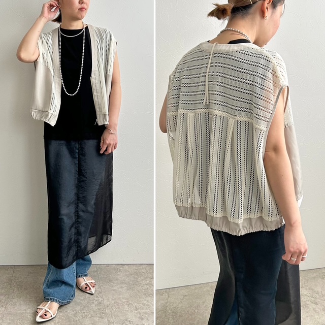 メッシュジレ💕 ストライプメッシュジレ ¥13,970(税込) まだまだ暑い夏ですが、こんなジレがあればいつものコーデが一新します。 大きめポケットがポイントのジレで、深めVネックにメッシュ素材でスッキリ夏らしく仕上げてあります。 裾ゴム入りでほんのりバルーンシルエットが可愛く 長すぎない丈感でスタイリングしやすい1枚。 Tシャツやタンクトップに羽織るだけでこなれ感あるスタイルを 完成させてくれるアイテムです。 素材本体:ポリエステル94% ポリウレタン6% 別布部分:ポリエステル100% 2025年8月12日