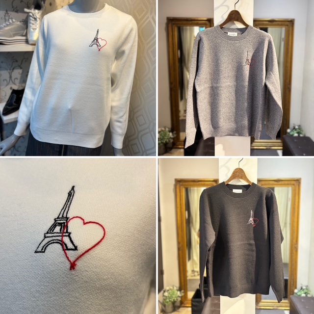 ROSIEE新作ニット💕 胸元にエッフェル塔とハートの刺繍をあしらったロージー(ROSIEE)フレンチ柄ニット✨ 毛足のない滑らかな生地で、ボトムとのバランスが良い程よい丈感です✨ 【素材】 レーヨン50%、ポリエステル30%、ナイロン20% 【カラー】 ホワイト、グレー、ブラック 【サイズ】 フリー ニット ¥13,000+tax 2025年11月17日