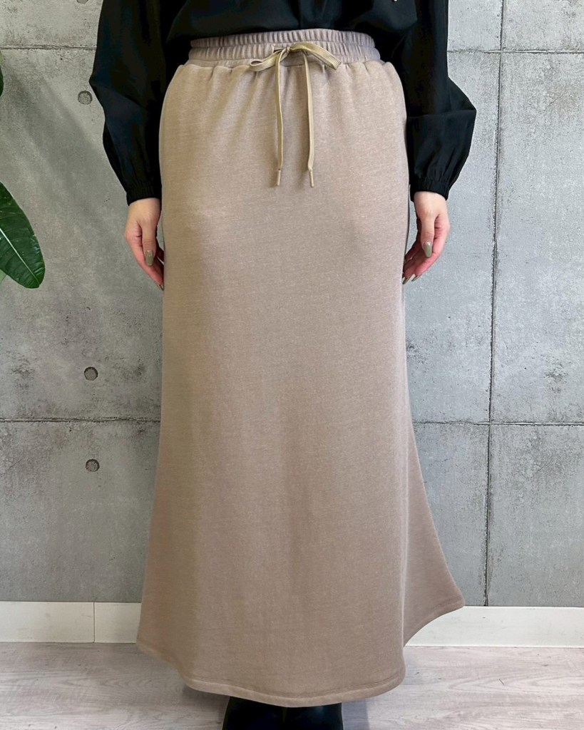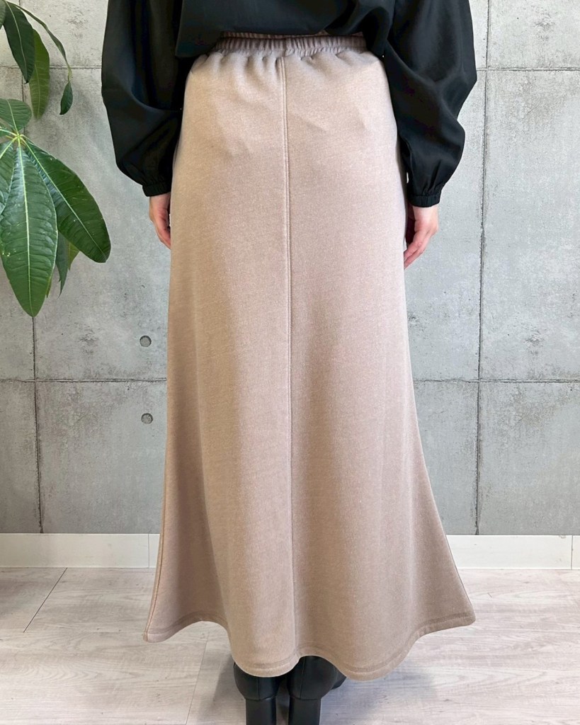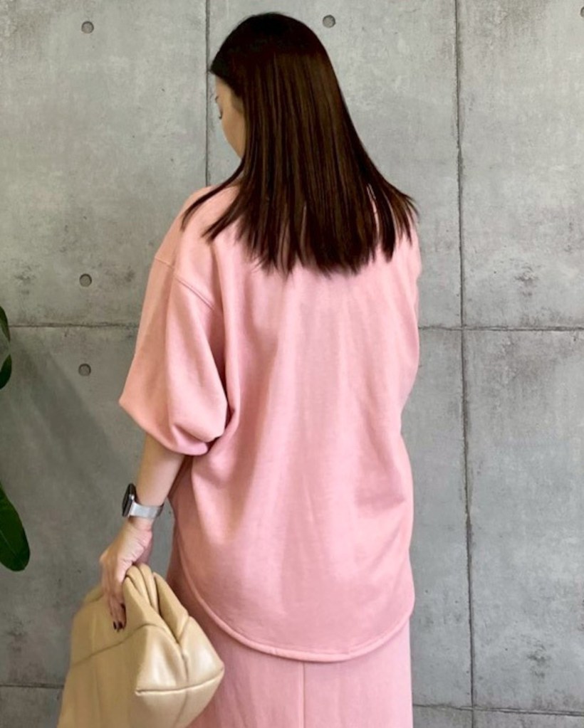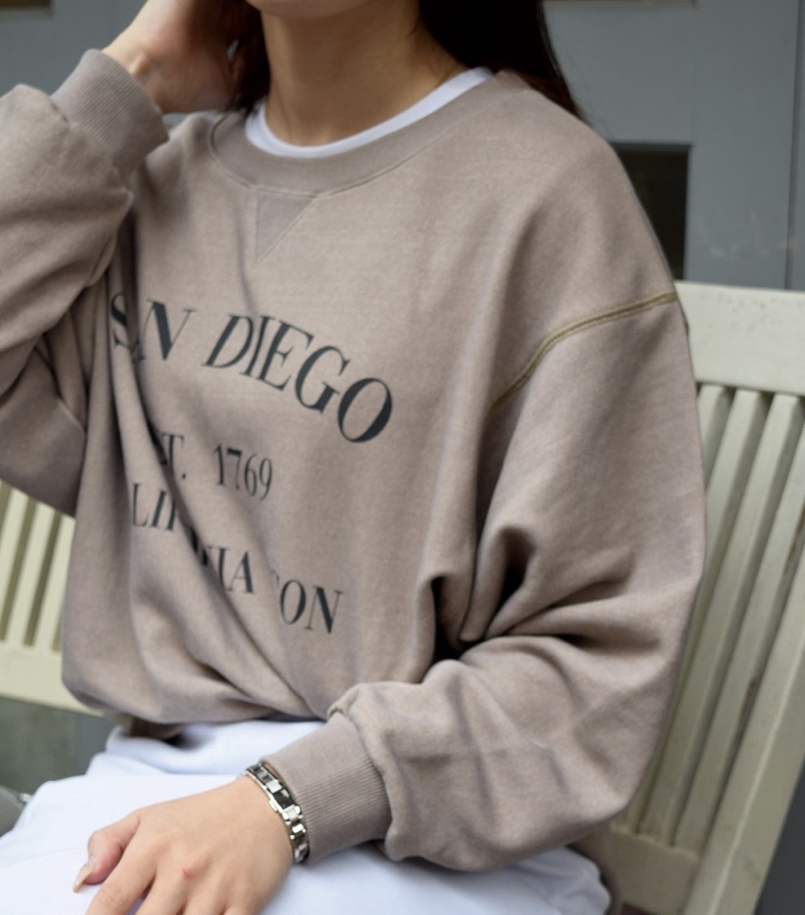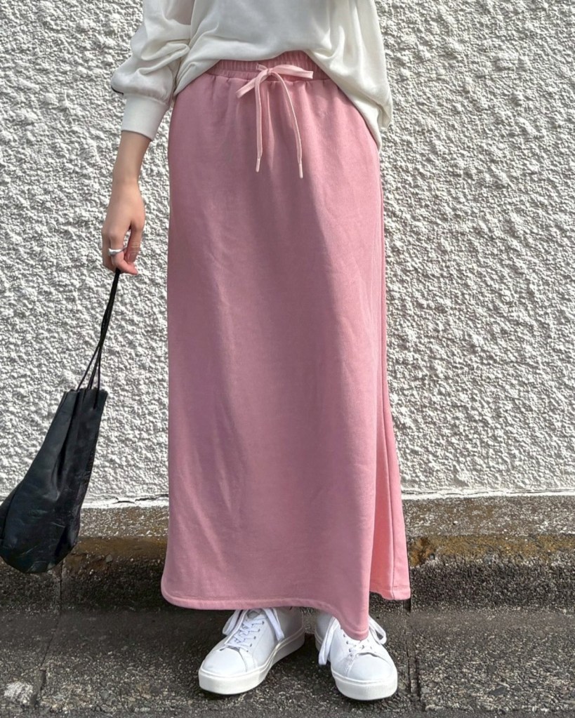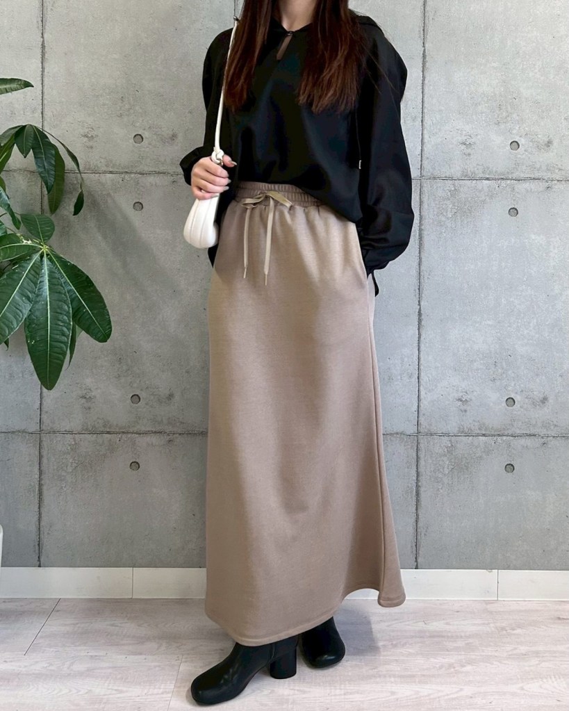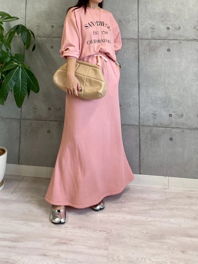 ヴィンテージ風のロゴプリントが素敵なトップスと、ヒップラインが目立たない、軽いセミフレアのスカートはいかがでしょうか?