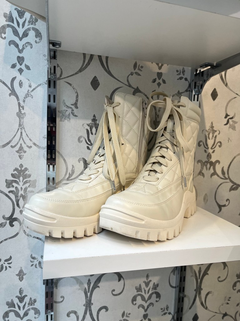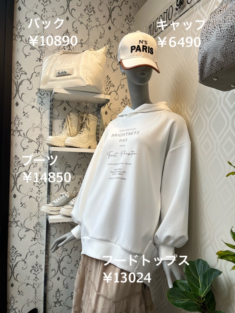 合わせてキャップやバック、白のキルティングブーツなら、今日みたいな雪や雨の日も快適ですよぉ〜