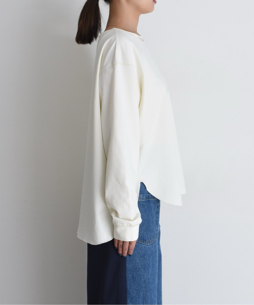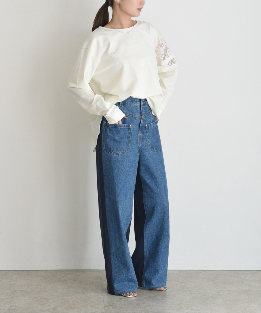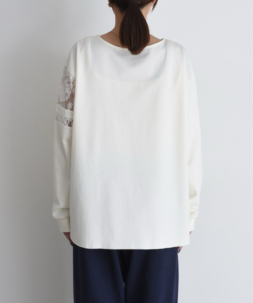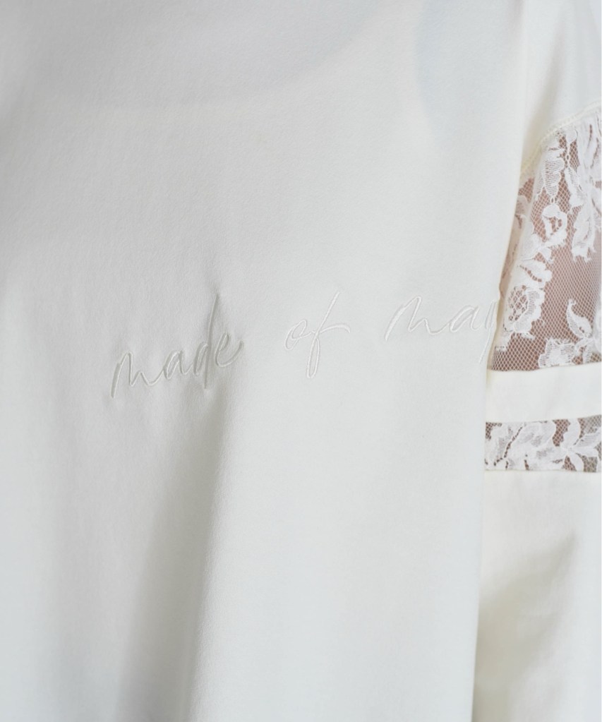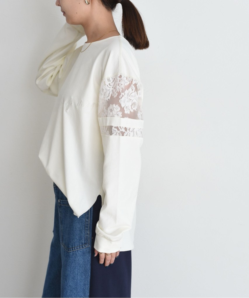 スリーブレース テキスト刺繍ラウンドヘムトップス