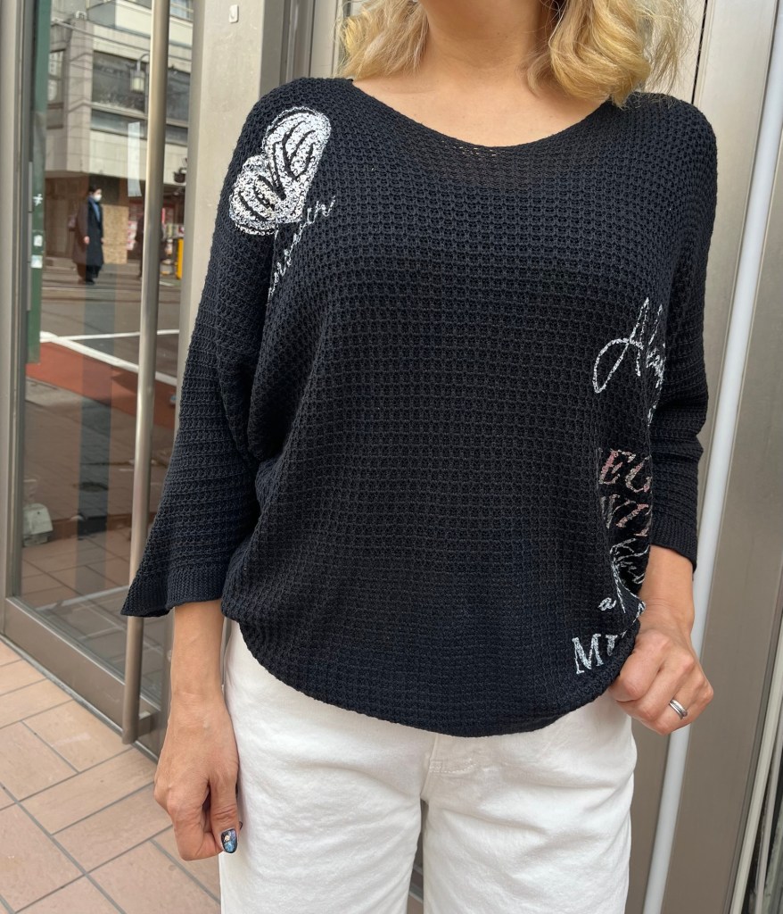 イタリア🇮🇹インポート 春ニット💕¥11000 サラッと着心地の良い春ニットがイタリアから入荷しました。 ハートやロゴのプリントがおしゃれです。 フリーサイズ 手洗い 可 ホワイトデニム XS〜XLまで展開中 ¥14960 税込 2026年2月28日