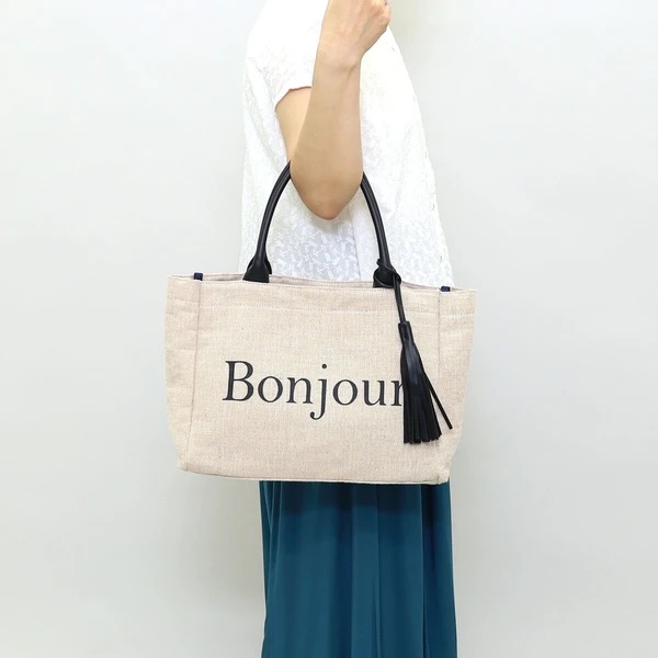 バッグの前面にあいさつをロゴプリントをしたトートバッグ